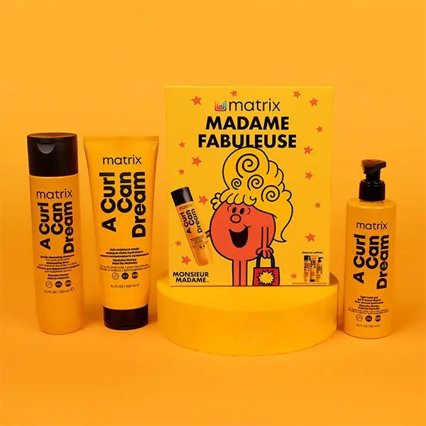 A chacun son Monsieur Madame ! Laissez-vous séduire par l'un des 4 coffrets trio Matrix & Monsieur Madame, disponibles en exclusivité dans vos salons de coiffure. Une occasion unique d'offrir ou de s'offrir une routine de soin professionnel infusée de la bonne humeur des célèbres personnages Monsieur Madame.