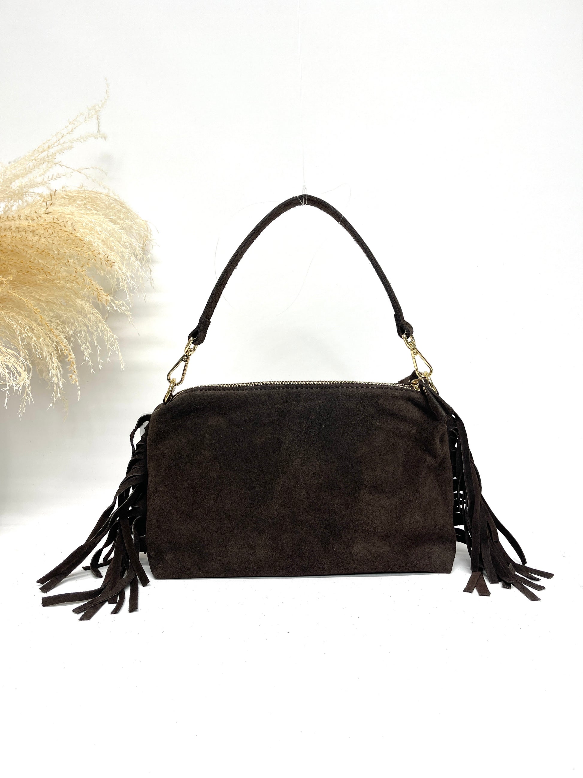 Un sac en daim italien raffiné, rehaussé de franges élégantes, à la fois pratique et stylé.